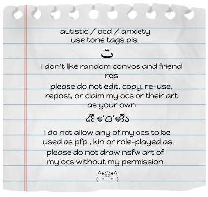 hello :Dyou can call me lala 𖦹 i've been in the art/oc fandom for 11 years and the furry fandom for 8 yearsi love to cook please send me recipes ꕥ barbie movies are my favorite ꕥ big fan of cryptids and scp ꕥ i have a small collection of dolls and plushieszoo wee mama ˙³˙